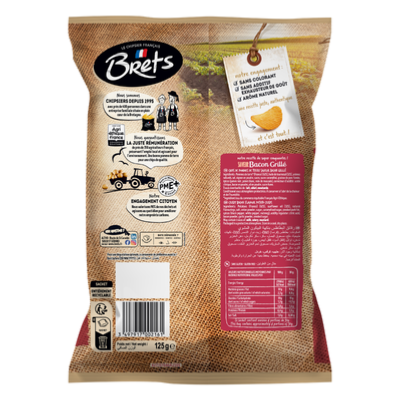 Chips de pommes de terre saveur bacon grillé - Ingrédients : Pommes de terre* (France) (62%), huile de tournesol (32%), arômes naturels, sel, oignon en poudre, sucre, sucre caramélisé, graisse de porc fumée, épices (poivre noir, poivre blanc, noix de muscade), correcteur d’acidité : acide citrique, bacon en poudre, ail en poudre, sucre fumé.