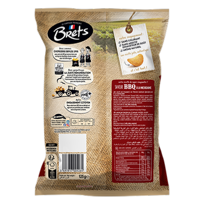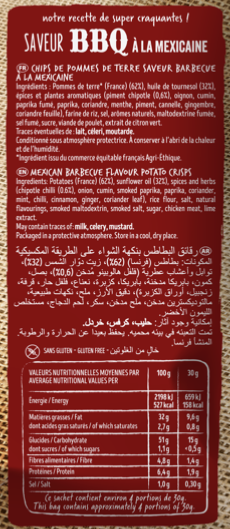 Pommes de terre* (France) (62%), huile de tournesol (32%), épices et plantes aromatiques (piment chipotle (0,6%), oignon, cumin, paprika fumé, paprika, coriandre, menthe, piment, cannelle, gingembre, coriandre feuille), farine de riz, sel, arômes naturels, maltodextrine fumée, sel fumé, sucre, viande de poulet, extrait de citron vert.