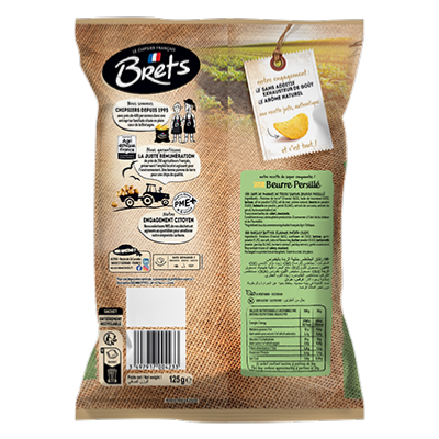 Pommes de terre* (France) (62%), huile de tournesol (32%), lactose, ail en poudre (1,2%), sel de mer, arôme naturel, beurre en poudre (0,6%), babeurre en poudre, persil (0,24%), extrait de curcuma, extrait de persil, huile essentielle d’ail.